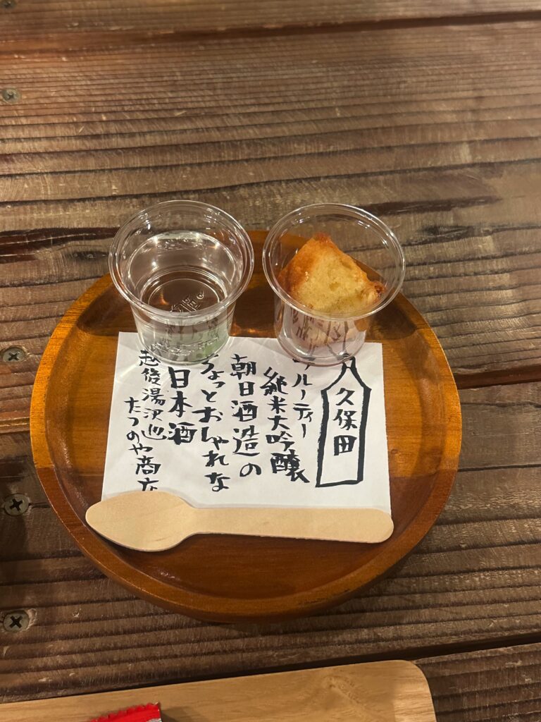 店内に試飲ができるお酒の種類と値段が書かれているので、大と小のカップどちらかを選び、お酒をお店の方にお願いします。