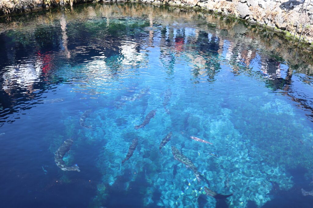 池の中の魚が浮いて見えるほどの透明感あふれる池と雄大な富士山が望める忍野八海。